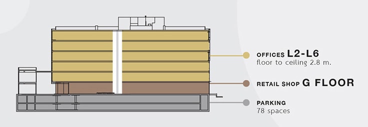 - อาคารสูง 6 ชั้น พื้นที่ให้เช่าทั้งอาคารประมาณ 5,000 ตารางเมตร สร้างเสร็จปี 2561 ลิฟท์โดยสาร 2 ตัว ลิฟท์จอดรถ 1 ตัว ความสูงของชั้น 2.80 เมตร ที่จอดรถประมาณ 80 คัน